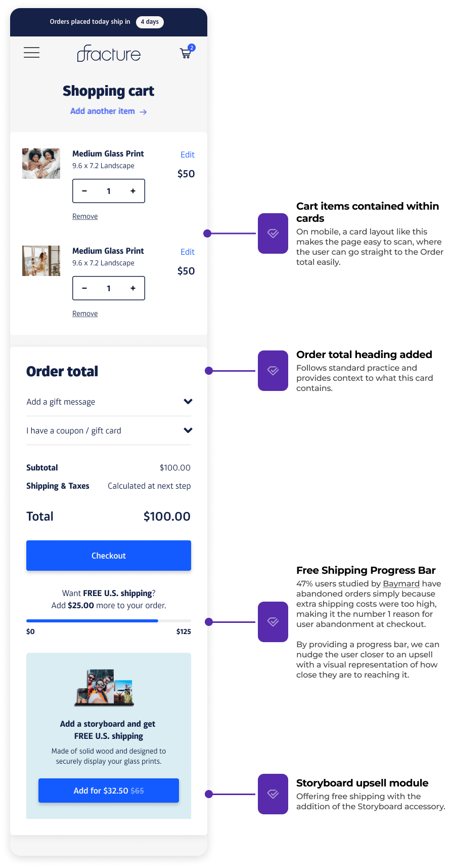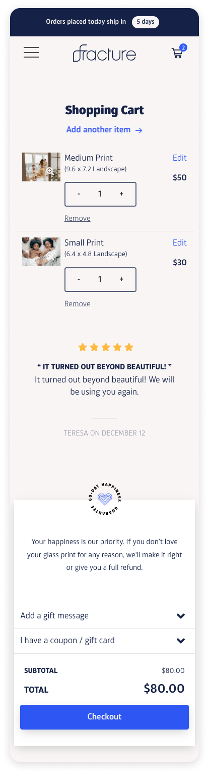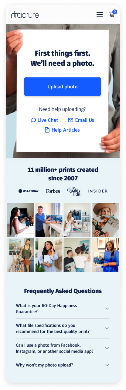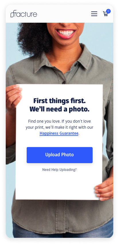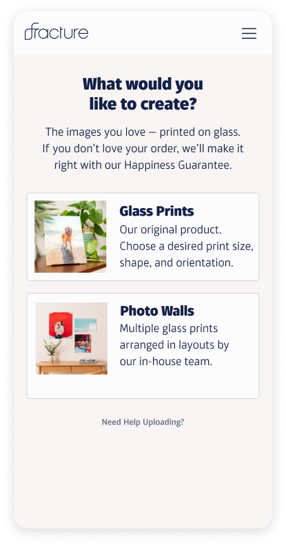 Fracture is an e-Commerce company that sells high quality prints on glass. One of the initiatives I worked on as Director of Design was improving the conversion rate, average order value, and user experience of the photo upload flow, the core feature of the web application.