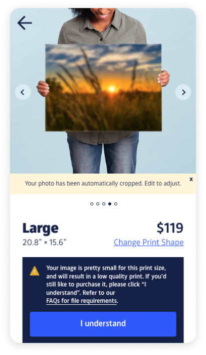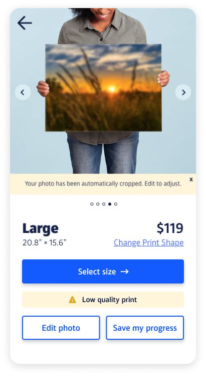 Print size selection process was confusing to users, particularly when their photos were not high enough resolution for the print size they’d selected.