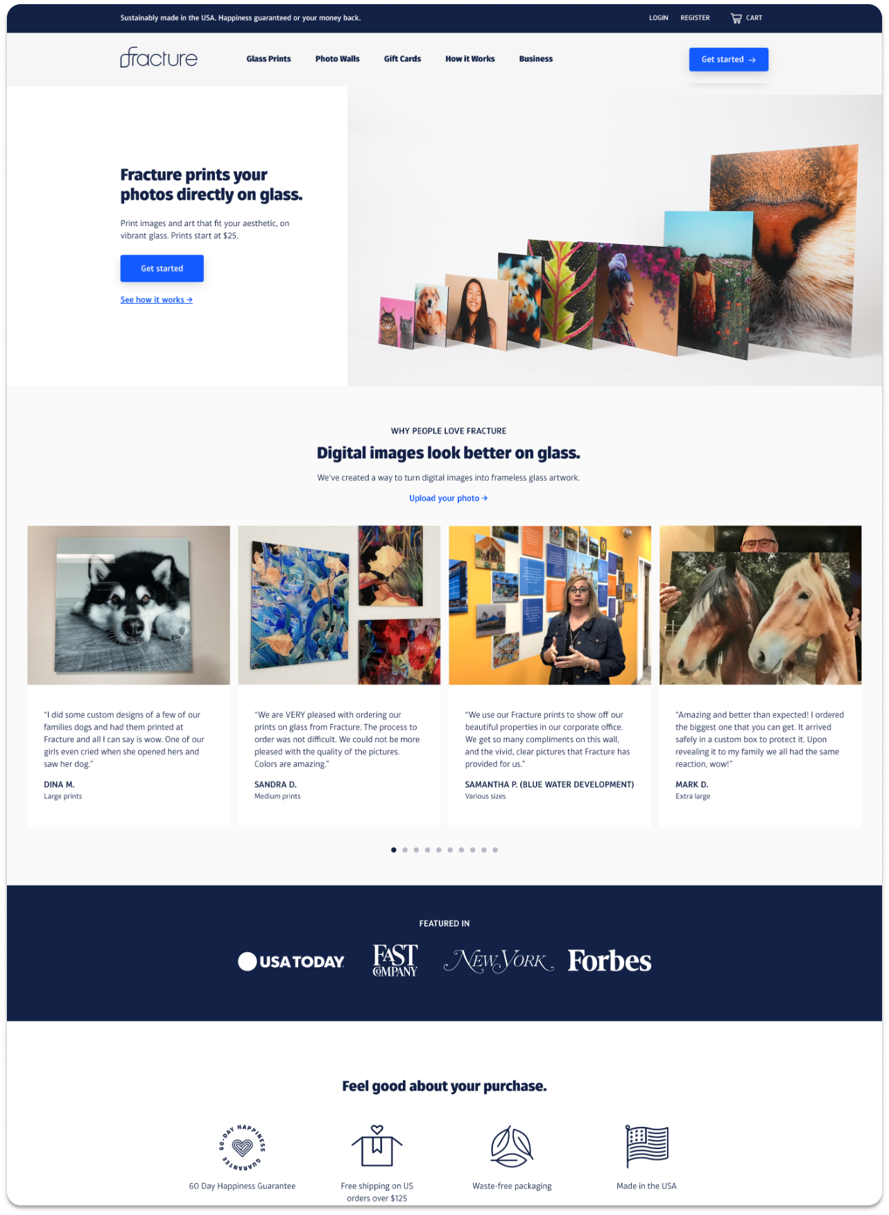 Fracture is an e-Commerce company that sells high quality prints on glass. Due to an outdated brand and a confusing name (a glass company called Fracture?), the CEO asked me to lead a renaming and rebranding of the company. I vetted a number of branding firms and eventually chose Ludlow Kingsley, due to their high end feel and their willingness to collaborate with the in-house team. The work shown here is a result of part of my collaboration with them.