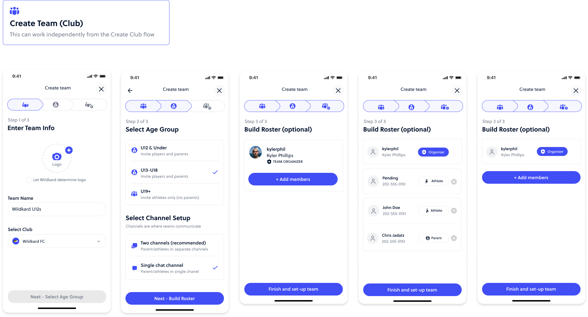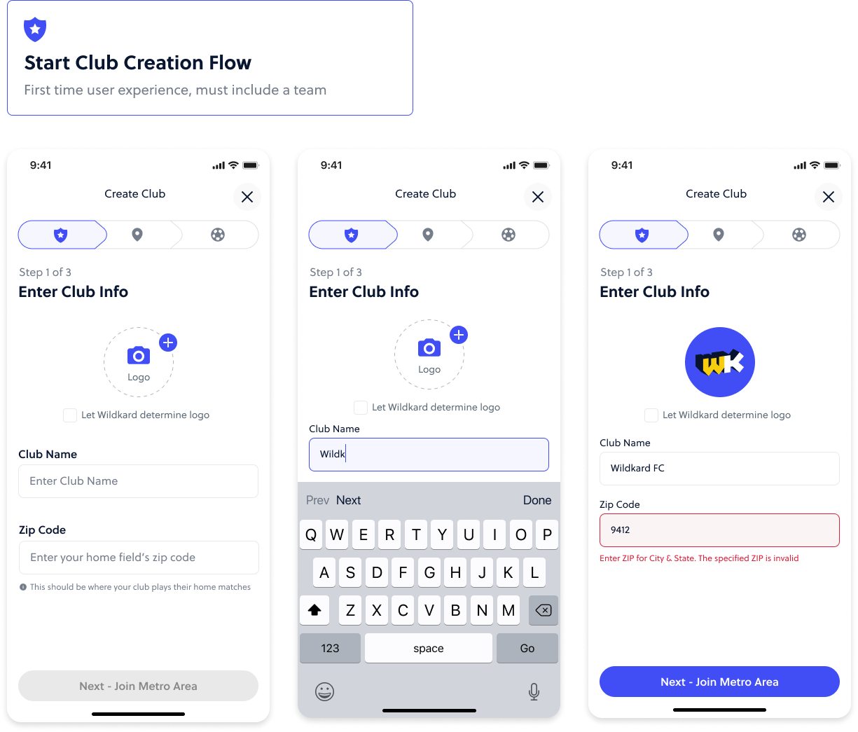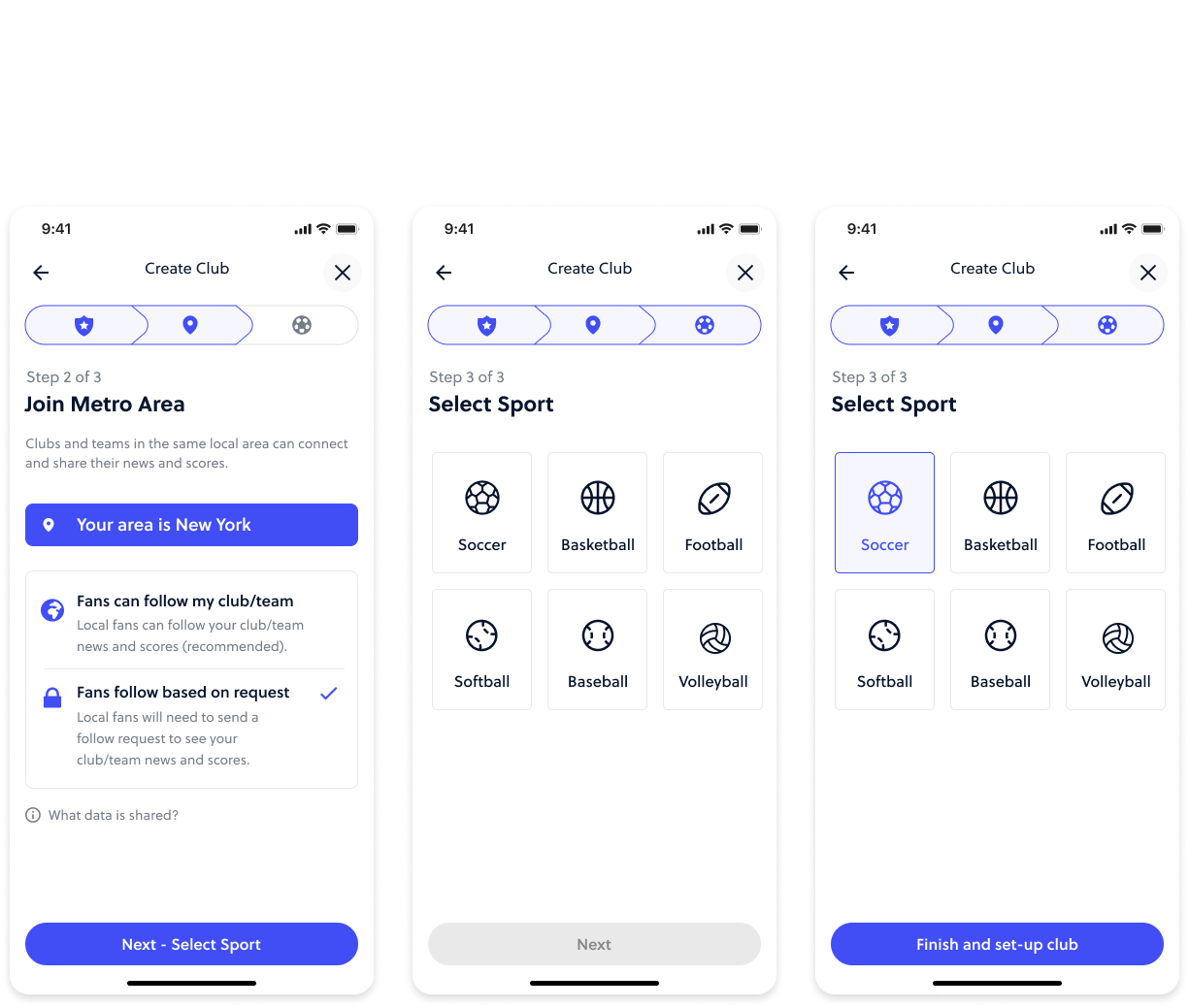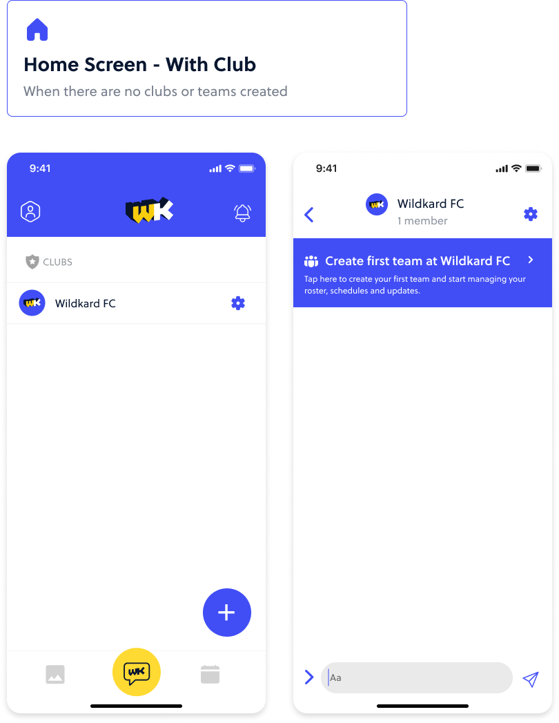 In this use case, a club admin creates their first club from the home screen empty state. Users can create a club or a team (clubs are umbrellas that hold multiple teams). The user is led through a three step club creation flow.