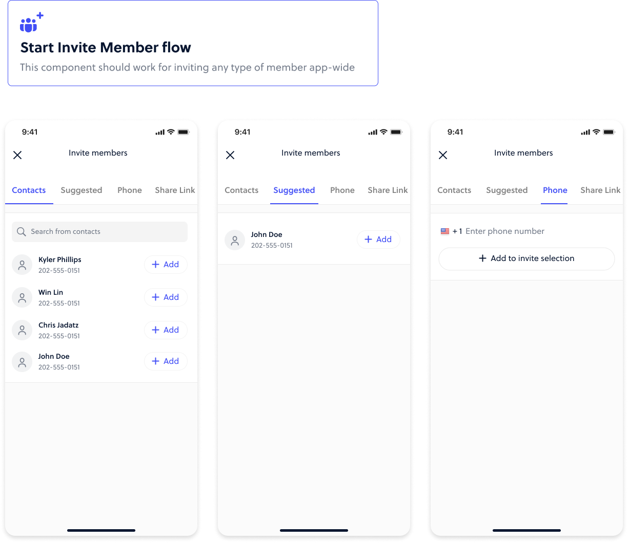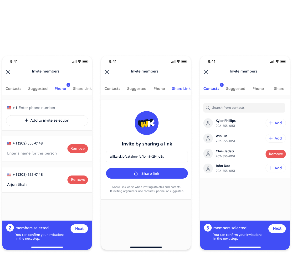 Once a team is created, members can be added through your Contacts, adding a phone number, suggested (through existing connections in the app), or through sharing a link.