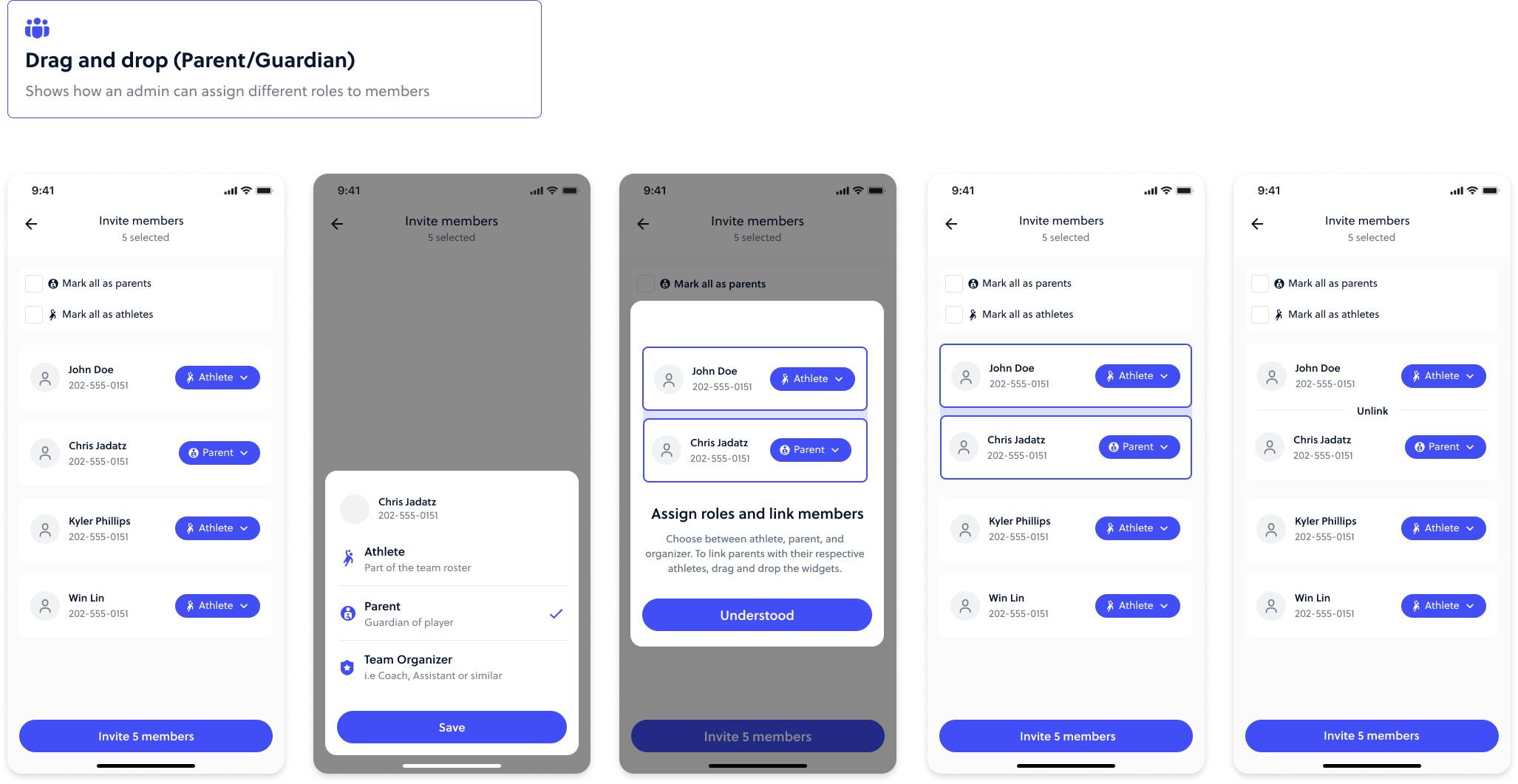In order to set up members appropriately, they need to be designated as athletes or guardians. And then athletes can be “linked” to their respective guardians through a drag and drop feature.