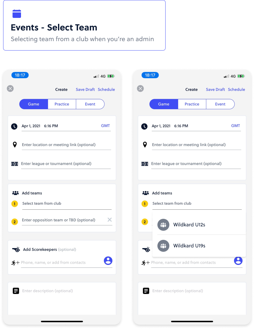 After a club is created, admins can then add teams to their club. The team can be created immediately after club creation or can be created from the home screen once a club exists.